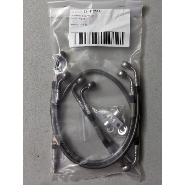 Durites de frein avant + arrière renforcées type aviation de marque SPIEGLER pour BMW R1150 RT 01-04 (Type R11RT / R22) (05 durites avant + arrière - Montage original - Version ABS II)