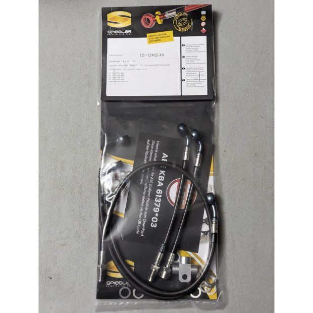 Durites de frein avant + arrière renforcées type aviation de marque SPIEGLER pour BMW R1150 GS 98-01 (Type R21) (04 durites avant + arrière - Montage original - Version NON ABS - protection de butée TOURATECH intégrée)