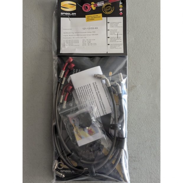 Durites de frein avant + arrière renforcées type aviation de marque SPIEGLER pour KAWASAKI Versys 1000 15-18 (Type LZT00B) (05 durites avant + arrière - Montage original - Version ABS - avec tubes acier rigides)
