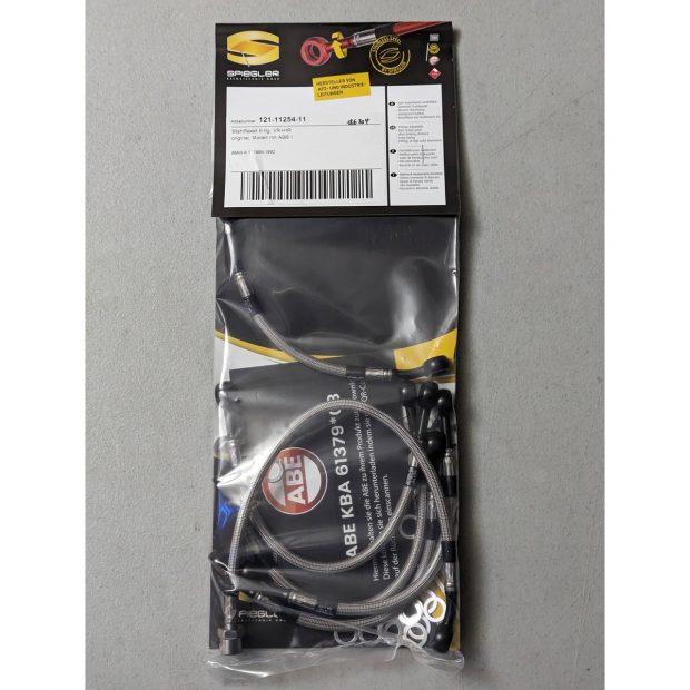 Durites de frein avant + arrière renforcées type aviation de marque SPIEGLER pour BMW K1 89-92 (Type BMW100) (06 durites avant + arrière - Montage original - Version ABS I)