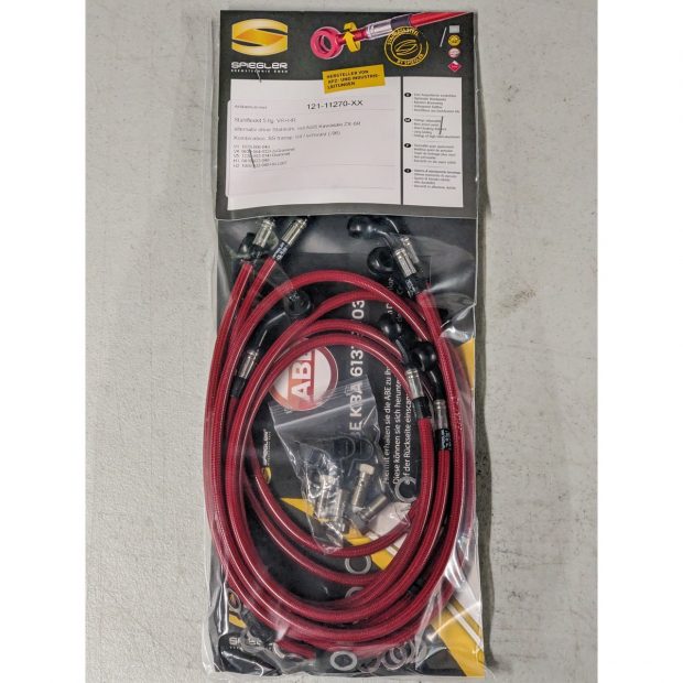 Durites de frein avant + arrière renforcées type aviation de marque SPIEGLER pour KAWASAKI ZX-6 R (Type ZX636G / F) (05 durites avant + arrière - Montage alternatif - sans tubes acier rigides - Version ABS)
