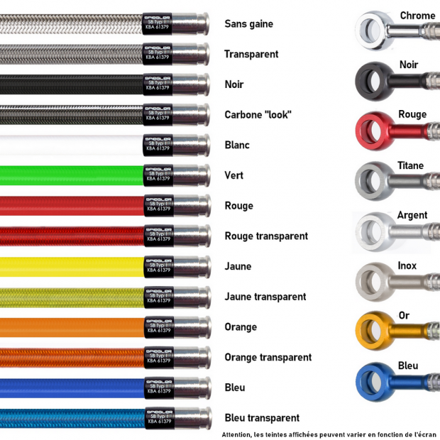 Nota : Le choix de couleur d’anodisation de banjos (pièces en aluminium) n’inclus pas les raccords à visser males ou femelles (pièces en inox) qui resteront en couleur « Inox ».