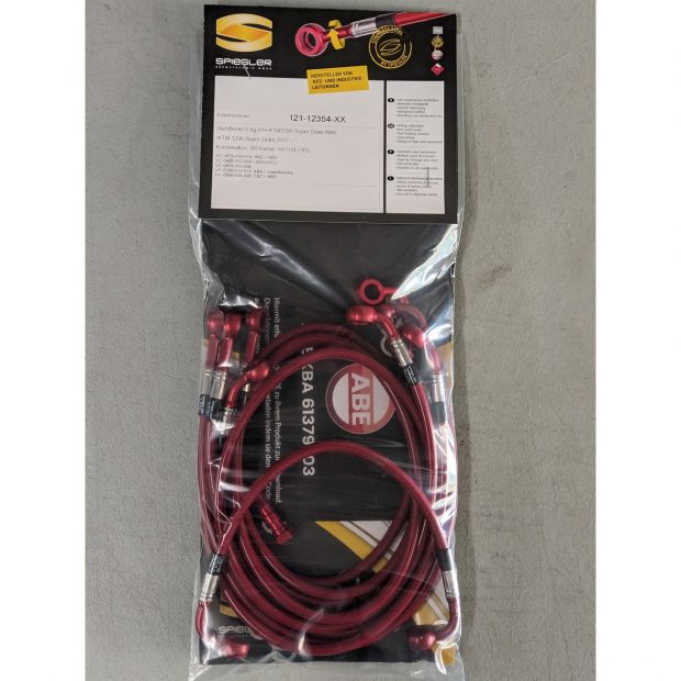 Durites de frein avant + arrière renforcées type aviation de marque SPIEGLER pour KTM 1290 Super Duke R 17- (Type A2/SD/KTM LC8) (06 durites avant + arrière - Montage original - Version ABS)