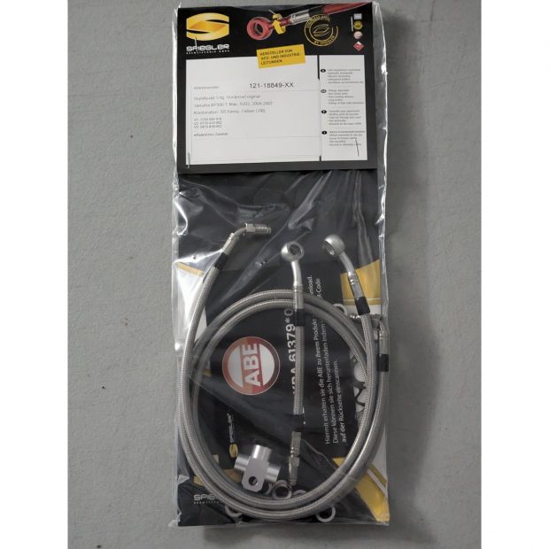 Durites de frein avant renforcées type aviation de marque SPIEGLER pour YAMAHA XP 500 TMAX 04-07 (Type SJ03) (03 durites avant - Montage original)