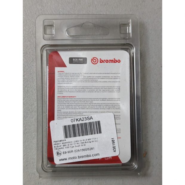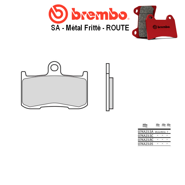 SA veut dire « Sinter Anteriore » en italien, soit « synther pour montage avant » en français ; ce qui signifie que cette plaquette de frein BREMBO fabriquée en matériaux synthérisés est le meilleur compromis pour le remplacement de la plaquette origine pour usage route. Ses composants se caractérisent par un coefficient de friction élevé et constant, démontrent donc une efficacité en toutes conditions d’utilisation, sec ou humide, aussi bien à froid qu’à des températures élevées. De ce fait, la plaquette de frein SA représente la meilleure solution pour une utilisation route standard et une usure modérée ; montage avec disques correspondants dont la valeur minimale de l’épaisseur d’utilisation préconisée par le fabricant est contrôlée ; adaptez l’échéance de remplacement le cas échéant. Pour un montage à double disques, il est recommandé de changer les plaquettes de frein des deux étriers en même temps, au même titre que les disques. Pour une utilisation plus intensive comme les routes sinueuses ou la montagne, vous favoriserez alors la gamme « LA ».