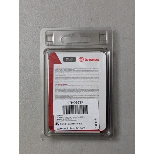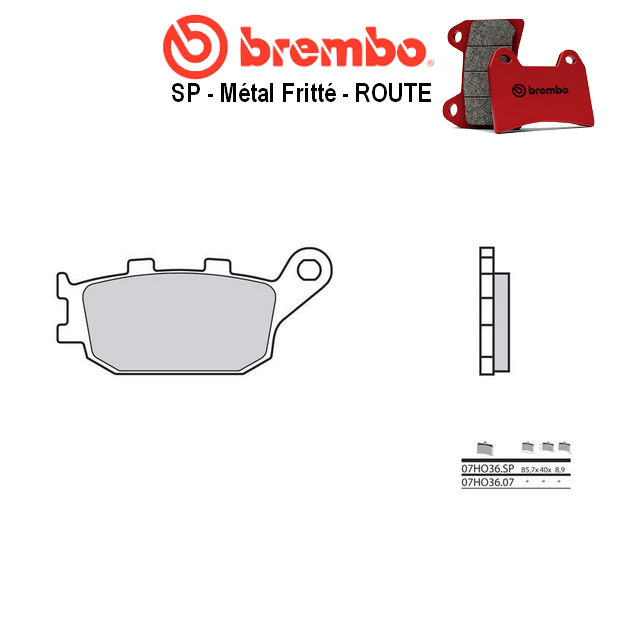 SP veut dire « Sinter Posteriore » en italien, soit « synther pour montage arrière » en français ; ce qui signifie que cette plaquette de frein BREMBO fabriquée en matériaux synthérisés est le meilleur compromis pour le remplacement de la plaquette origine pour usage route. Ses composants se caractérisent par un coefficient de friction élevé et constant, démontrent donc une efficacité en toutes conditions d’utilisation, sec ou humide, stable aussi bien à froid qu’à des températures élevées. De ce fait, la plaquette de frein SP représente la meilleure solution pour une utilisation route standard et une usure modérée ; montage avec disques correspondants dont la valeur minimale de l’épaisseur d’utilisation préconisée par le fabricant est contrôlée ; adaptez l’échéance de remplacement le cas échéant.