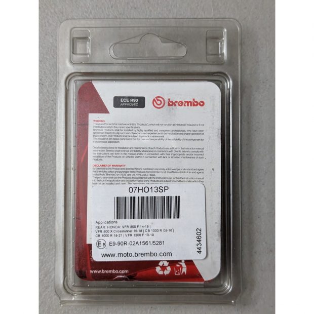 SP veut dire « Sinter Posteriore » en italien, soit « synther pour montage arrière » en français ; ce qui signifie que cette plaquette de frein BREMBO fabriquée en matériaux synthérisés est le meilleur compromis pour le remplacement de la plaquette origine pour usage route. Ses composants se caractérisent par un coefficient de friction élevé et constant, démontrent donc une efficacité en toutes conditions d’utilisation, sec ou humide, stable aussi bien à froid qu’à des températures élevées. De ce fait, la plaquette de frein SP représente la meilleure solution pour une utilisation route standard et une usure modérée ; montage avec disques correspondants dont la valeur minimale de l’épaisseur d’utilisation préconisée par le fabricant est contrôlée ; adaptez l’échéance de remplacement le cas échéant.