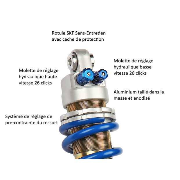 Info fabricant : les amortisseurs EMC peuvent recevoir de nombreuses options de nature à modifier leur esthétique. Les produits présentés sur les photographies peuvent dans certains cas être équipés d’options. Nous vous rappelons donc que conformément aux CGV les photographies ne sont pas contractuelles. Si vous désirez une option spécifique, n’hésitez pas à contacter notre service client qui saura vous orienter vers la configuration optimale.